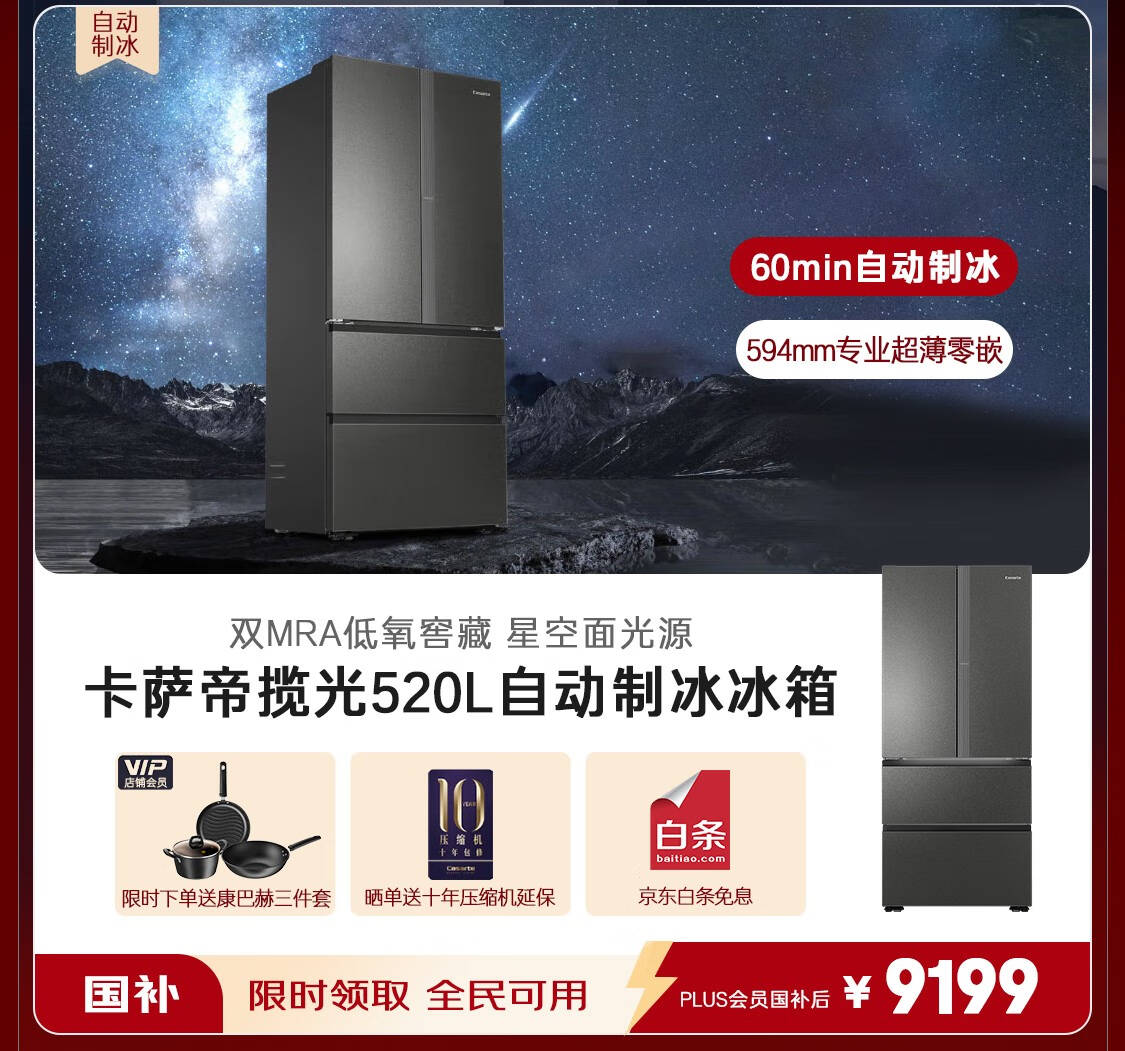 卡萨帝(Casarte)揽光星空版521升594mm超薄零嵌入式双系统十字四开门国家补贴20%一级能效冰箱BCD-521WGCTDM4WKU1