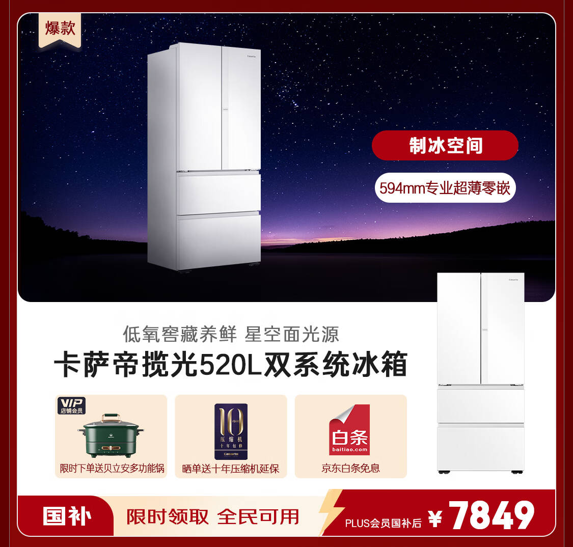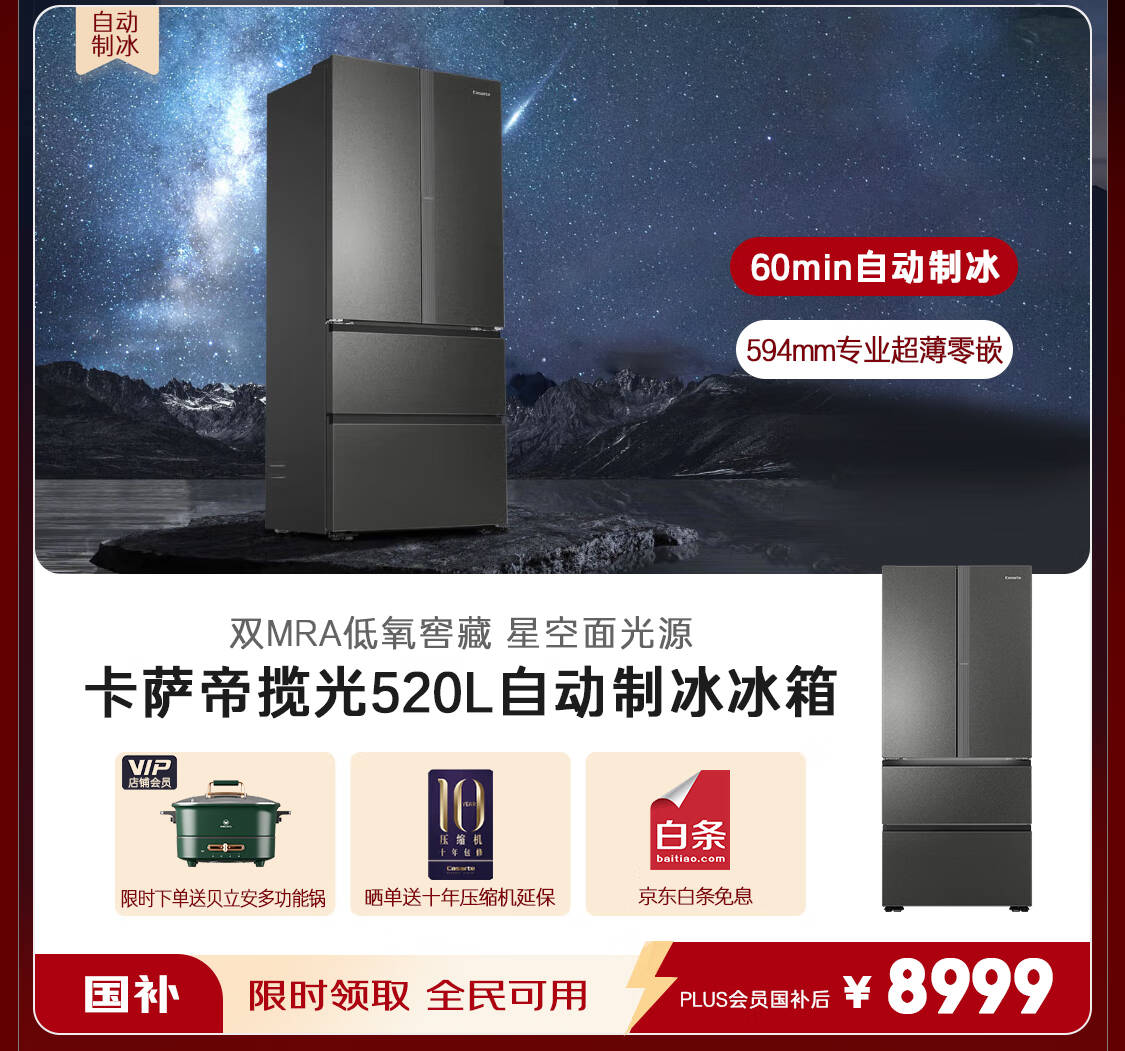 卡萨帝(Casarte)揽光星空版521升594mm超薄零嵌入式双系统十字四开门国家补贴20%一级能效冰箱BCD-521WGCTDM4WKU1
