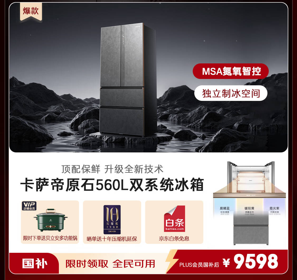 卡萨帝(Casarte)原石系列MRAPLUS低氧窖藏保鲜594MM超薄零嵌十字门家用电冰箱一级能效以旧换新BCD-518WGCTDM4GUU1