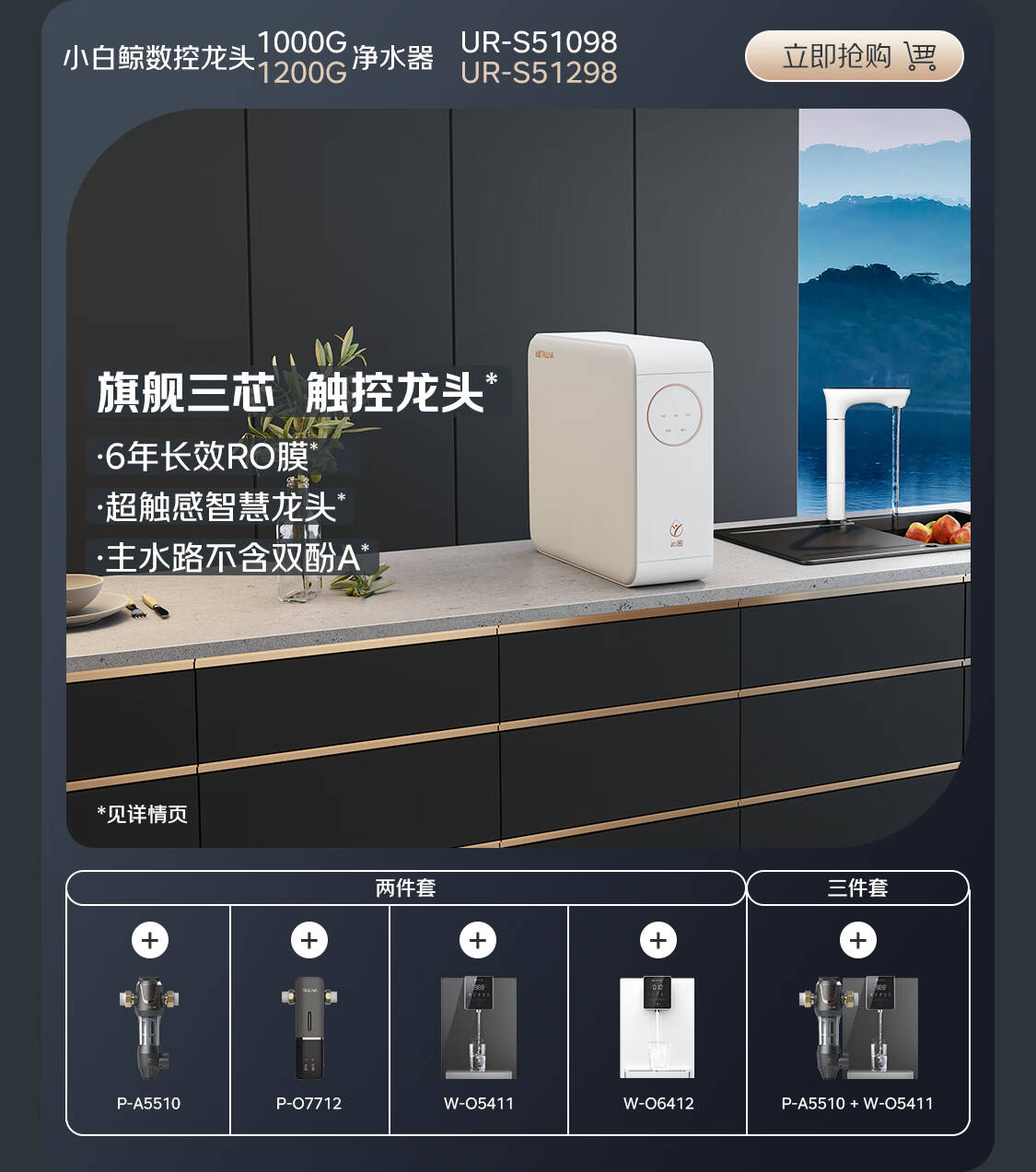 沁园(TRULIVA)净水器机家用小白鲸1000Gpro 6年RO反渗透过滤器 厨下式直饮水机UR-S51045+加热管线机W-O5411