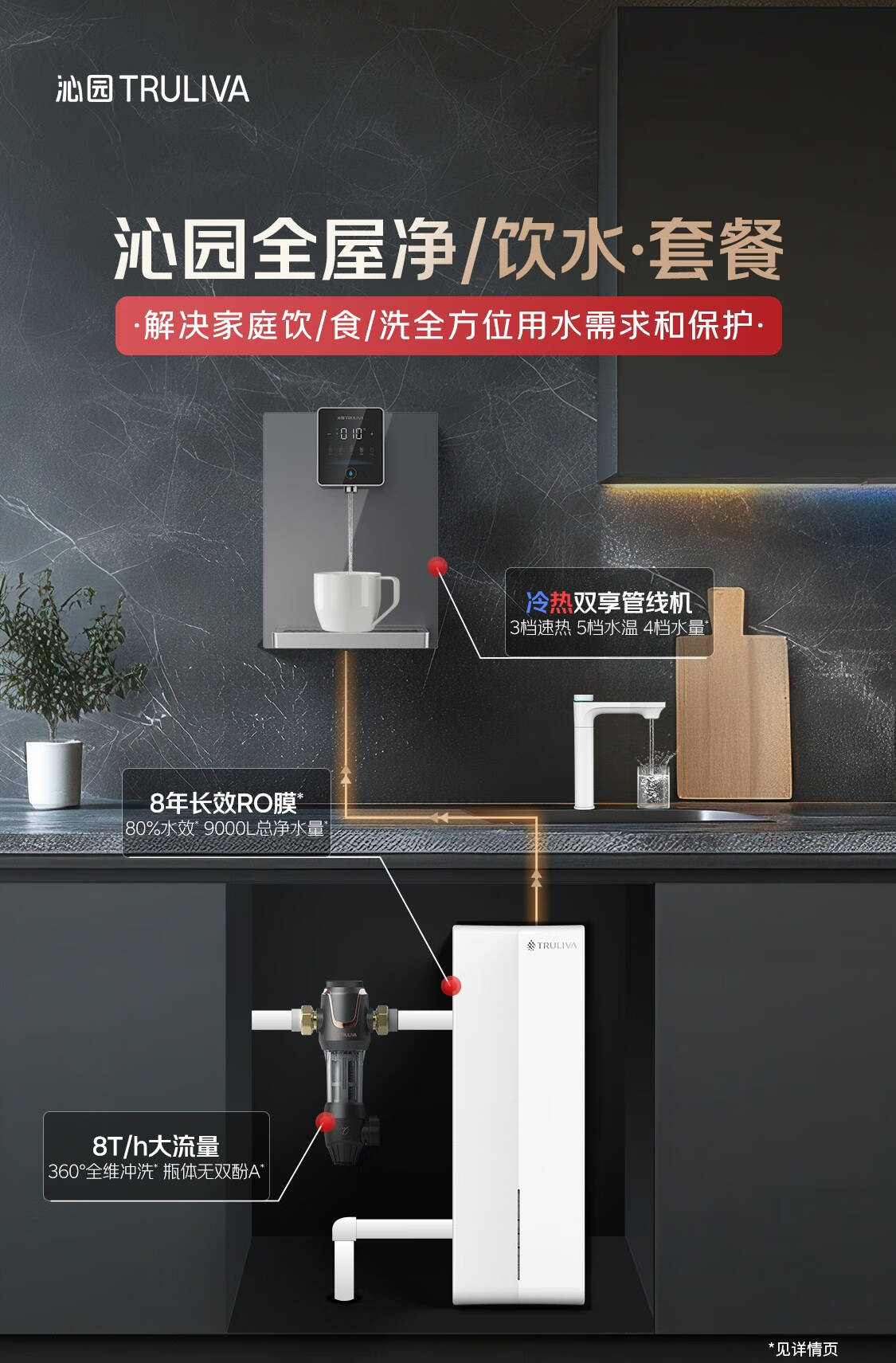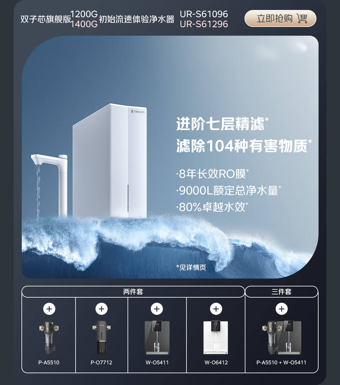 沁园(TRULIVA)净水器机家用双子芯3.2L/分钟等于1200G流速体验UR-S61096+前置过滤器P-A5510+加热管线机W-O5411