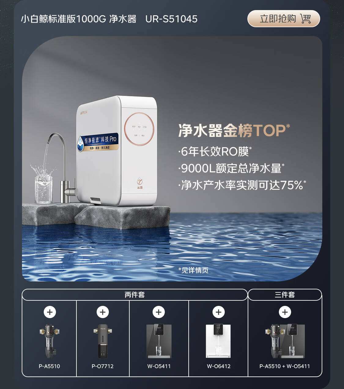 沁园(TRULIVA)净水器机家用小白鲸1000Gpro 6年RO 厨下式直饮水机UR-S51045+前置过滤器P-A5510(黑)
